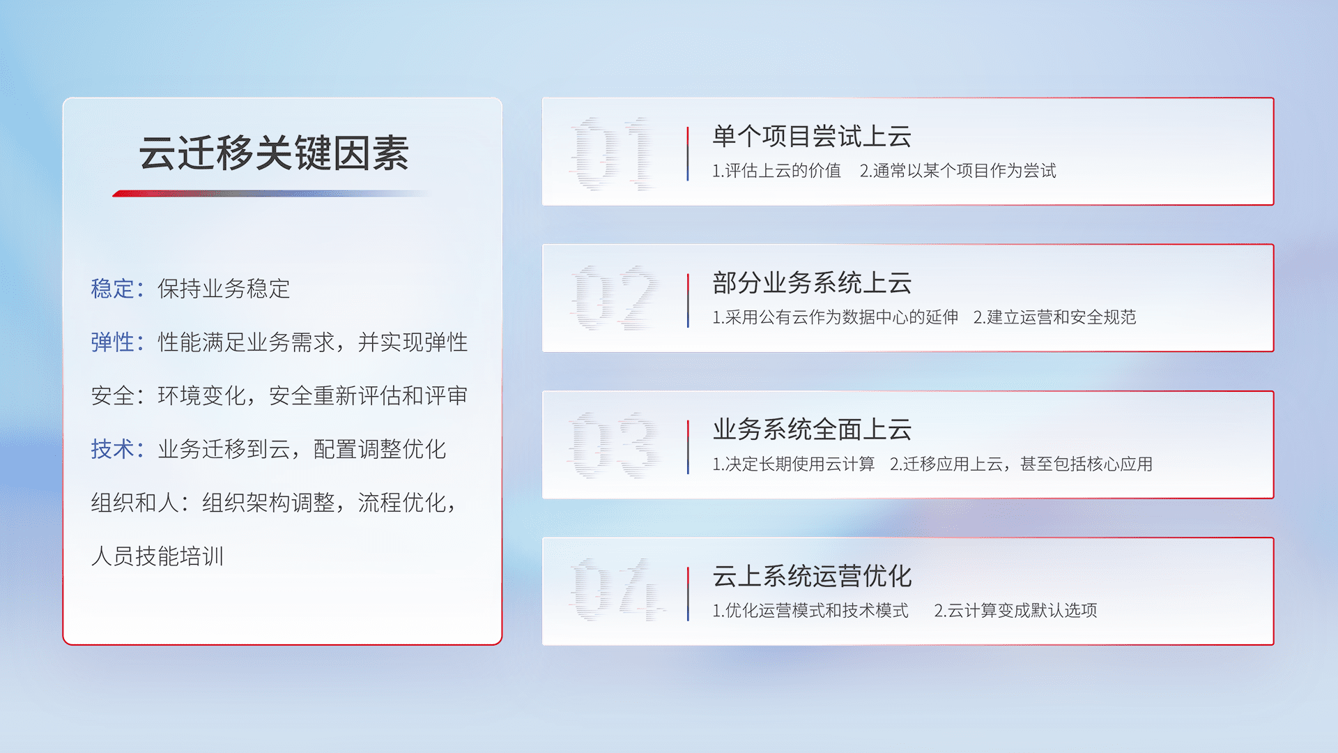 结合实际业务,,,,从规划设计、、、云平台选型、、云原生改造、、、、数据迁移、、、集成交付,,迁移全过程为客户识别最佳上云路径,,,做好风险识别管理,,,设计网络架构、、身份权限、、安全审计合规、、、、操作审计、、、、日志审计、、、、监控告警策略、、多站点容灾设计等,,,对云上基础设施进行整体规划,,提升IT治理水平,,,,以满足弹性、、、高可用、、、高性能的需求。。。。