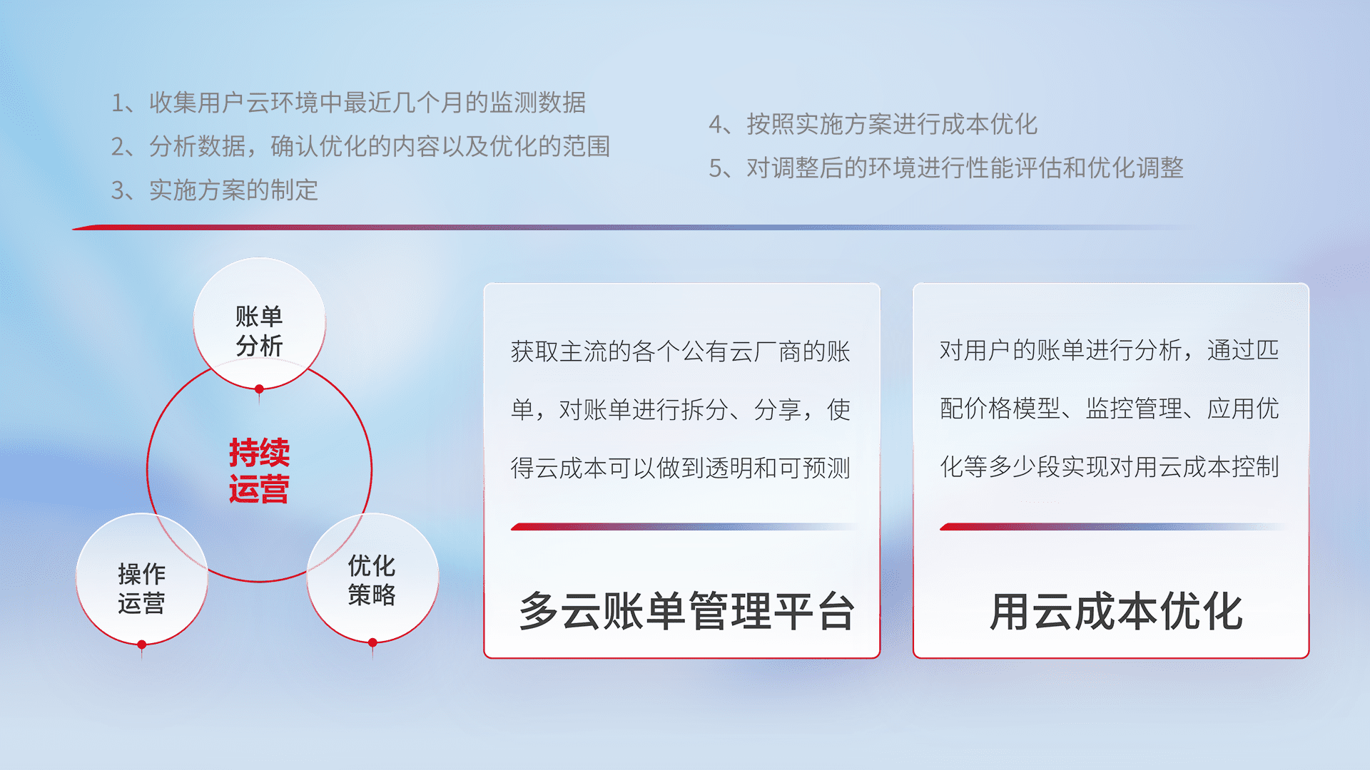 通过多云纳管,,以统一的资源数据模型把客户的云资源进行抽象和封装,,进而实现对多云资源的统一操作,,保障云资源管理的可靠性、、、、稳定性与可用性。。。。量身定制化运维内容,,,,配置、、开发运维、、补丁管理、、、备份、、、监控、、、认证和访问管理、、、审计和日常巡检等,,保障在用云过程中的可靠度,,,,稳定度以及高可用率。。。
