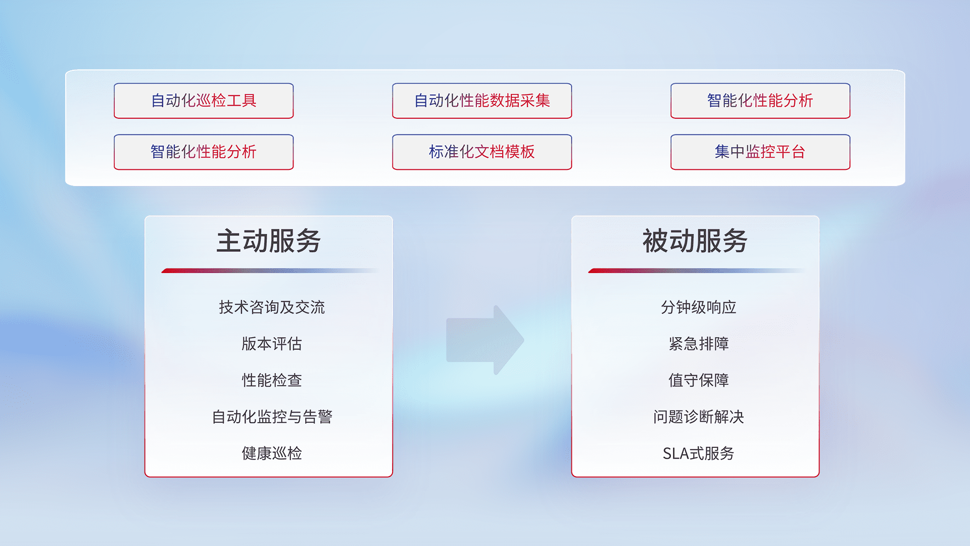 智能化工具和标准化文档,,,保障服务质量,,,,提供主动服务(包含技术咨询、、、、版本评估、、性能检查、、自动化监控与告警、、、健康巡检)和被动服务包含(分钟级响应、、、紧急排障、、值守保障、、、、问题诊断解决、、、SLA服务)。。。。